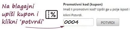 3) Na kraju kupovine u Internet blagajni u prozorčić ˝Promotivni kod˝ utipkaj svoj kod 0004 i klikni tipku „Potvrdi“. Od konačnog iznosa narudžbe oduzeti će ti se vrijednost odabranog poklona. Kod se ne može upotrijebiti zajedno s drugim kodovima za popust!